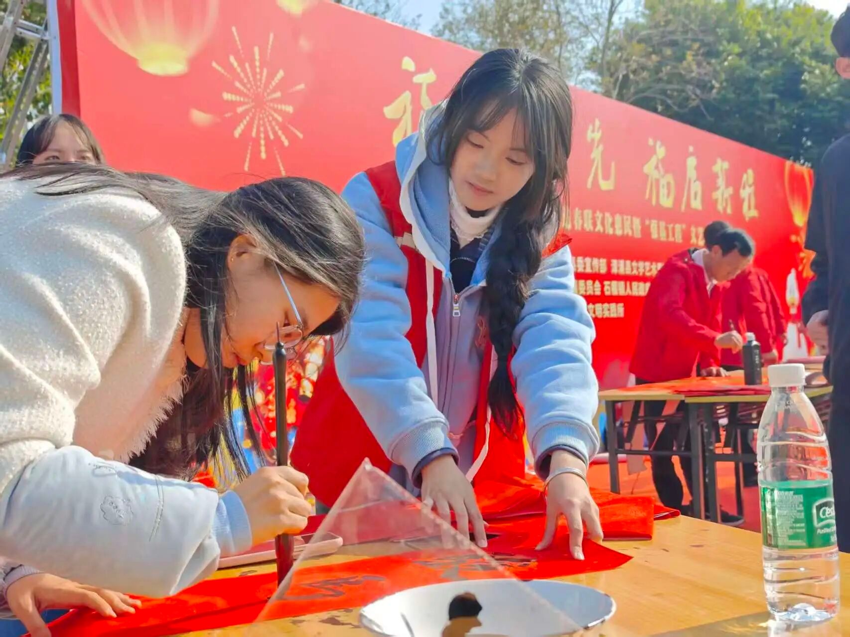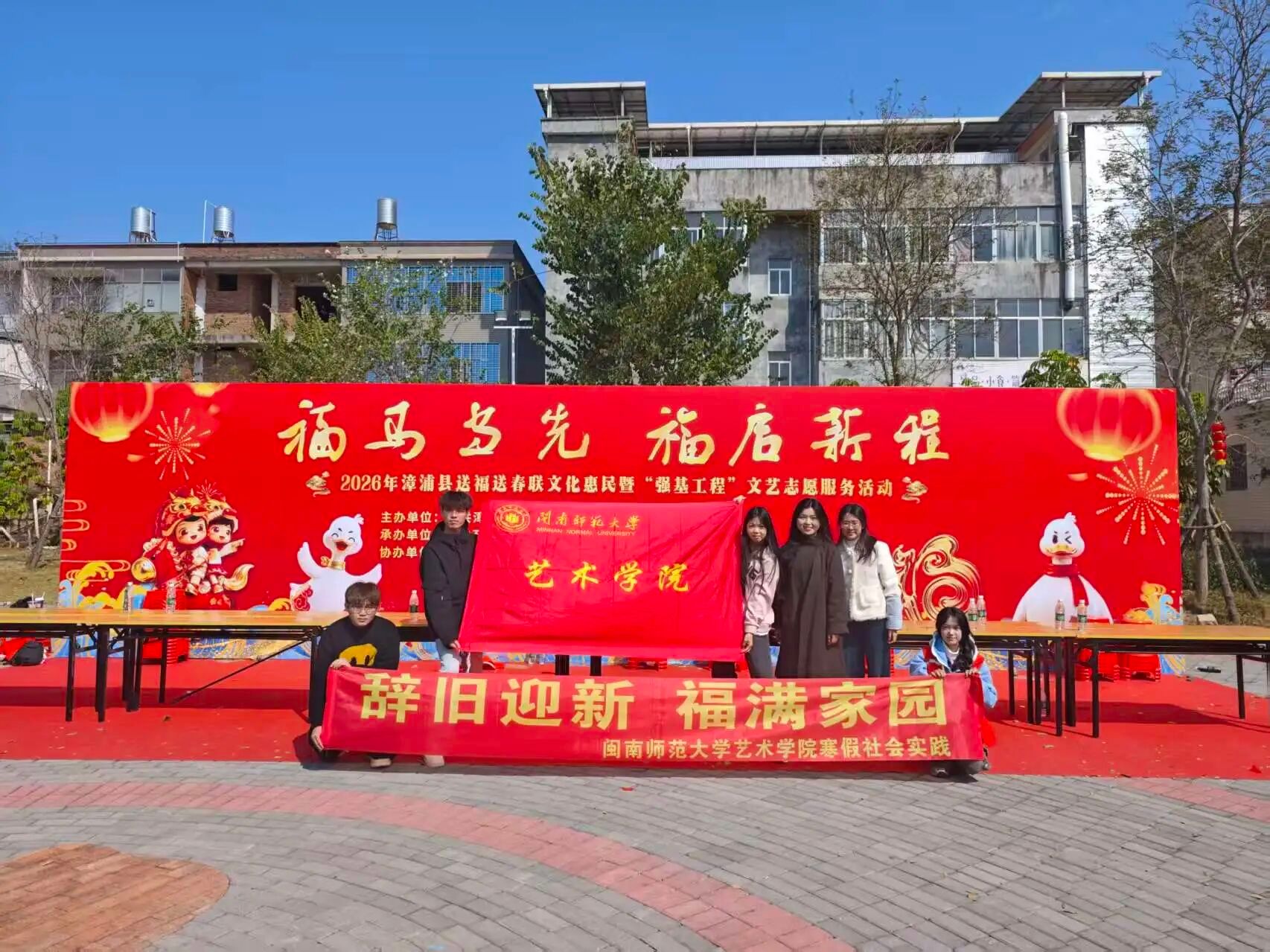 在漳浦县石榴镇填鸭公园,师生志愿者开展现场写春送福活动,师生们依托公园场地,现场铺纸研墨、挥毫书写,将一幅幅饱含吉祥寓意的“福”字与春联送到当地群众手中,进一步推动中华优秀传统文化进基层、接地气、聚民心,让艺术服务真正融入百姓生活。