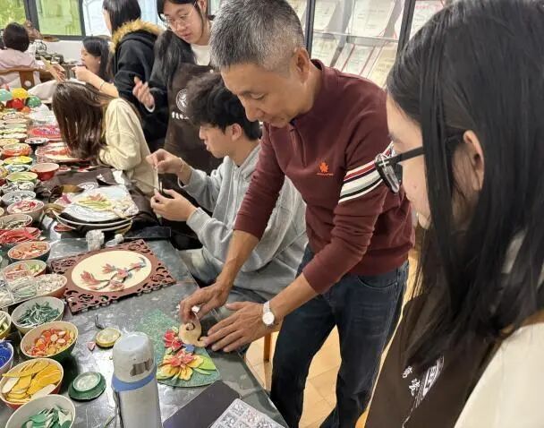 同学们沉浸式观摩珍品、记录工艺细节,亲身参与制作,从瓷片剪切到镶嵌拼接,在实操中体悟工艺精髓,深入思考“传统工艺材料创新”“非遗与现代美术教学融合”等专业问题,实现从“技艺体验”到“学术探究”的跨越。