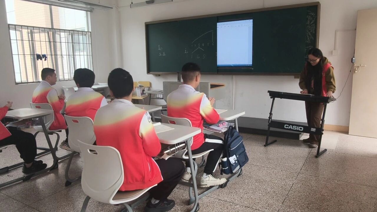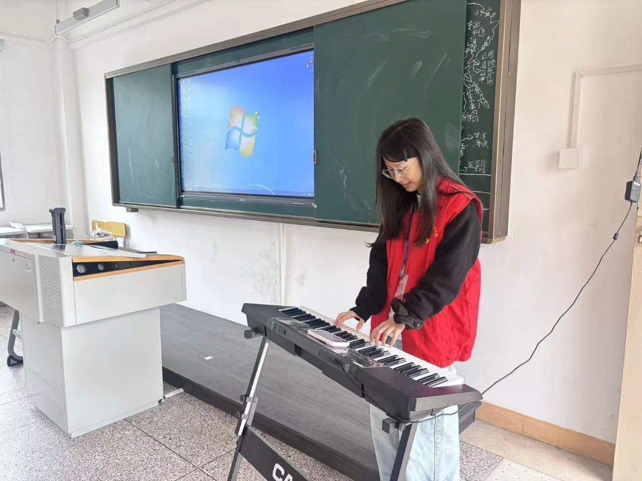 教学安排组的志愿者们则全力协助维护现场秩序,保障教学展示环节顺利进行。志愿者们将专业特长融入志愿服务之中,在维护班级秩序的同时,特别关注残疾学生群体。他们发挥音乐专业优势,即兴开展了一场温馨有趣的“音乐小课堂”——弹奏轻快童谣,指导学生使用节奏乐器打拍,带领大家哼唱熟悉歌曲。灵动的旋律与耐心的互动,不仅消融了学生们的陌生感,更用音乐搭建起沟通的桥梁,让特殊学生在欢声笑语中感受艺术的温度,为教学展示环节注入了一份独特温情。