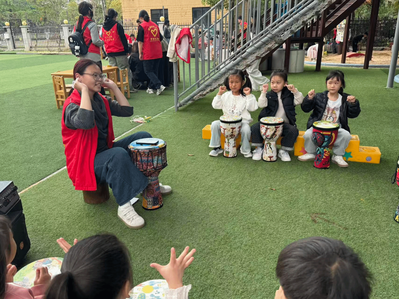 为推动雷锋精神走出校园、走向社会,以艺术形式向少年儿童传递向善向上的正能量,志愿者们走进校园周边幼儿园,开展“童心绘雷锋,鼓乐传精神”特色志愿服务活动。志愿者们用生动通俗、童趣盎然的语言,为小朋友们讲述雷锋叔叔助人为乐、爱岗敬业、无私奉献的暖心故事;手把手指导小朋友拿起画笔,在画纸上认真勾勒雷锋形象、描绘助人为乐的生动场景,用童真的笔触表达对榜样的敬意。同时,志愿者们发挥艺术专业优势,带来非洲鼓现场伴奏,以欢快活泼的节奏带领小朋友们齐声学唱《学习雷锋好榜样》,稚嫩歌声与欢快鼓点交织,让雷锋精神在童趣互动中浸润童心,在幼小心田播下奉献、友爱、互助的种子。
