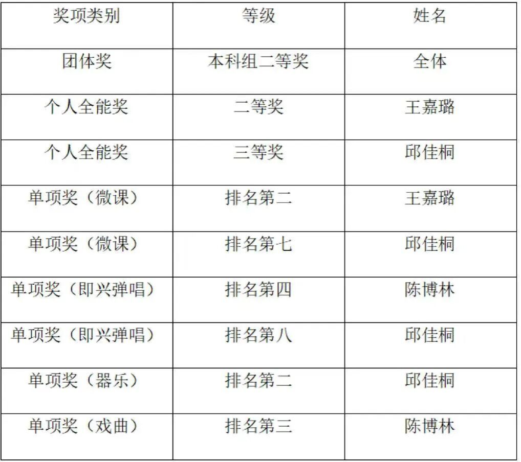 荣获本科组团体二等奖。个人奖项方面,王嘉璐同学获得个人全能二等奖及微课单项奖;邱佳桐同学获得个人全能三等奖及微课、即兴弹唱、器乐单项奖;陈博林同学斩获即兴弹唱与戏曲两个单项奖,展现出全面的音乐素养。