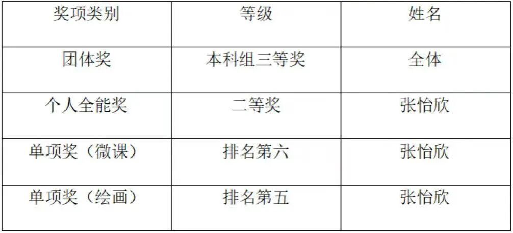 荣获本科组团体三等奖。张怡欣同学表现突出,获得个人全能二等奖,并同时拿下微课、绘画两个单项奖,充分体现了其扎实的教学能力与艺术创作水平。